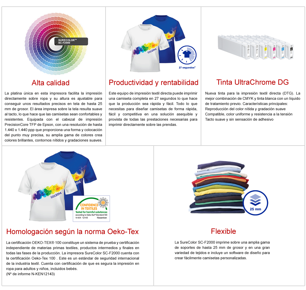 Presentación de la SureColor SC-F2000, una impresora de impresión textil directa, perfecta para la impresión de camisetas.Es todo lo que necesitas para iniciar un negocio con verdadero potencial de beneficios, al imprimir una camiseta en 27 segundos de forma sencilla y fiable. Además, su bajo consumo de tinta te ofrece magníficas oportunidades con un alto retorno de la inversión, por lo que resulta viable económicamente y da a tus clientes exactamente lo que buscan.